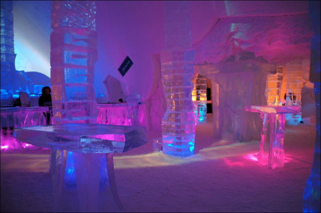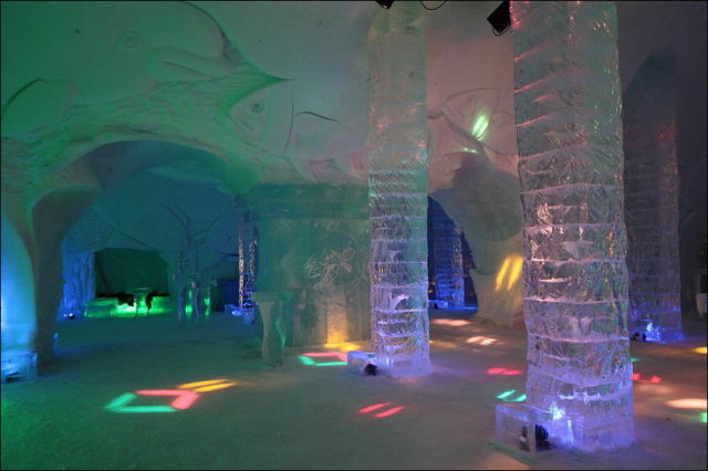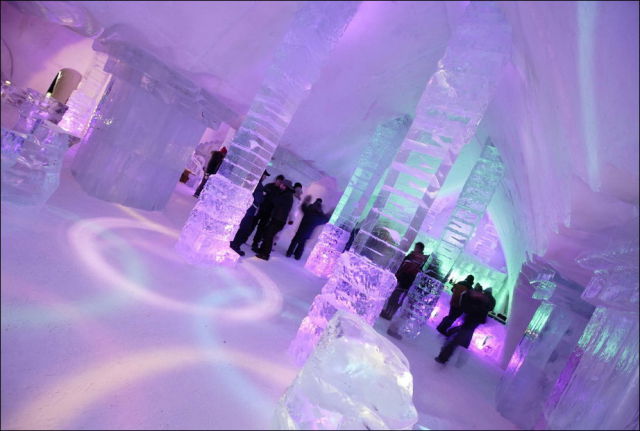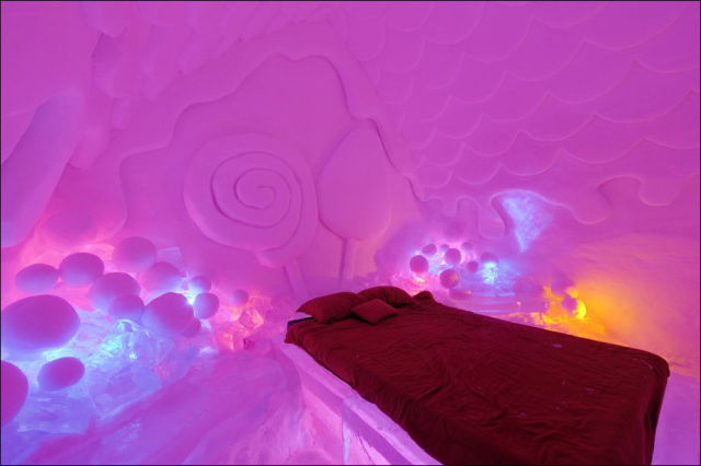 The Ice Hotel is built each year near Quebec City in Canada. It takes about a month and a half to build it. 60 workers, 15,000 tons of snow, 500,000 tons of ice and $350,000 help to make it real.