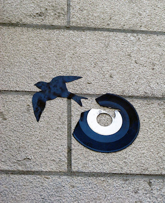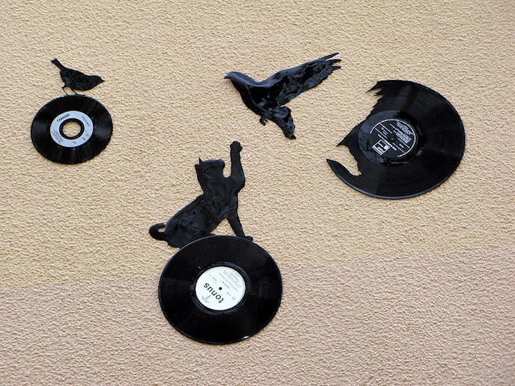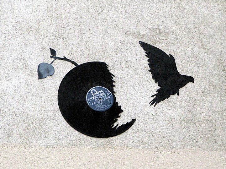 Street artist Kesa transforms vinyl records into a variety of birds and bats literally breaking free from their circular entities. The Lyon, France-based creative, who began his career as a graffiti artist back in 1996, utilizes the black plastic discs by repurposing them as public art silhouettes of animals with the gift of flight.