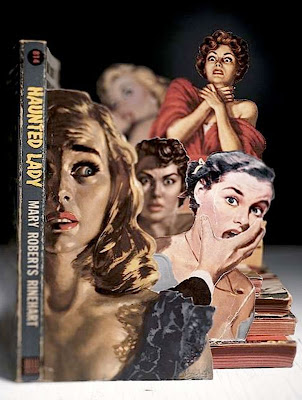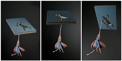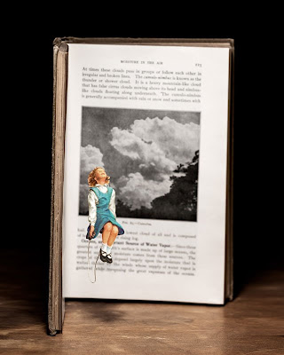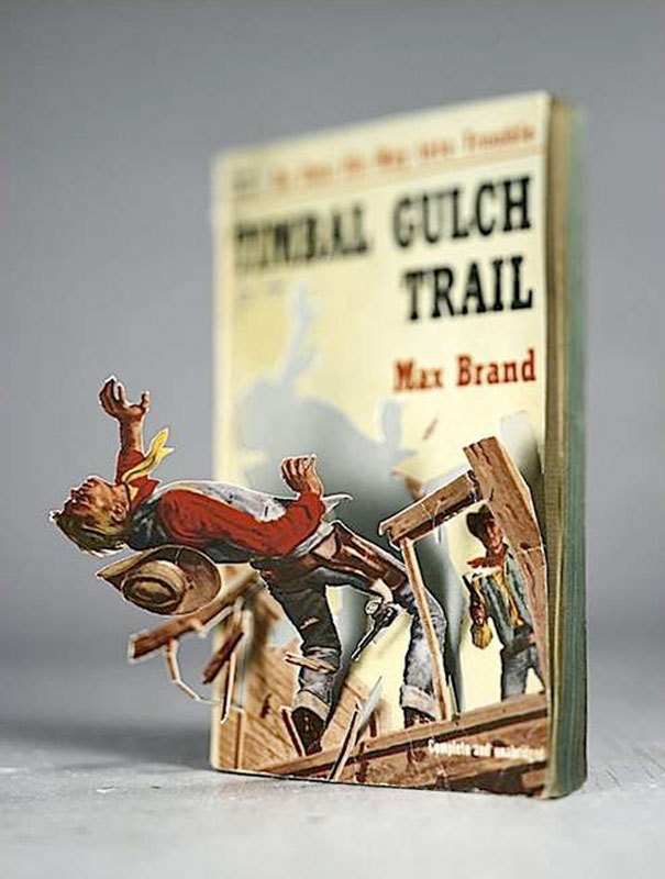 Inspired by a View-Master and pop-up books as a child, Thomas Allen became interested in recreating these three-dimensional experiences by using mid century books and pulp fiction paperbacks as still life subjects. Allen gently cuts around the shape of his figures, physically releasing them from their two dimensional surface, and then places them in a new display of meaningful interactions.