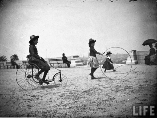 Young Isabel Harter riding a tricycle while her sister Nellie rolls a hoop, w. other children and adults in background, Ft. Greene, May 22, 1886 |