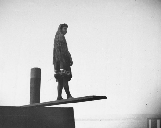 Young Miss Hall, w. very long hair, standing on a springboard and contemplating whether to jump, Ft Hamilton, New York, September 2, 1886 |