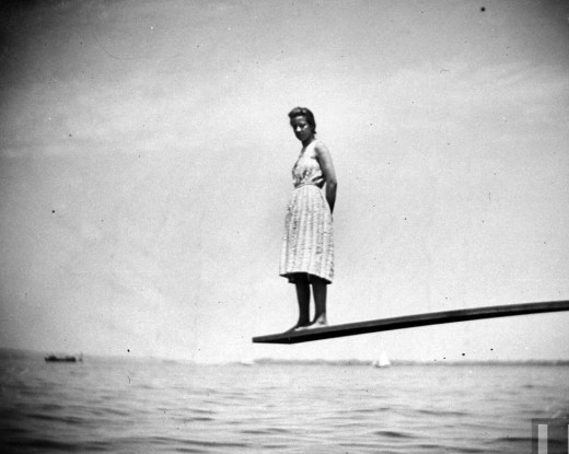 Maggie Ward standing on the end of a diving board at Coney Island, Brooklyn, July 24, 1888 |