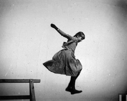 A man in a suit and bowler hat jumping in the air in a backyard in Brooklyn, New York, 1890 |