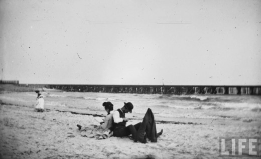 A fully-dressed couple sitting back-to-back while reading on beach; low wooden pier spans ocean in background, Manhattan Beach, New York, August 30, 1884 |