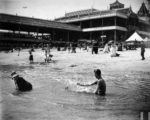 Bathers splashing in the surf as people stroll along the sand w. the enormous Lefferts pier looming in the bkgrd. at Brighton Beach, Brooklyn, New York, July 17, 1886 |