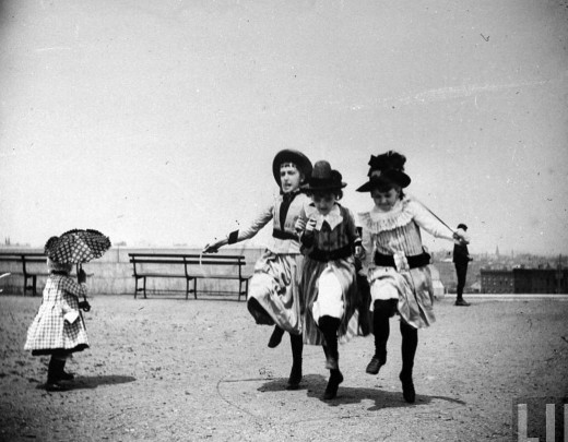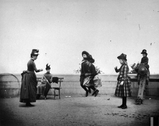 Three sweetly dressed girls jumping rope together, as nearby toddler with parasol looks on, Ft. Greene, Brooklyn, May 29, 1886 |