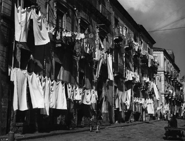 | Laundry is pinned across an entire building on wash day in Sicily. 1955. (Patrick Miller/Archive Photos / Getty Images) |