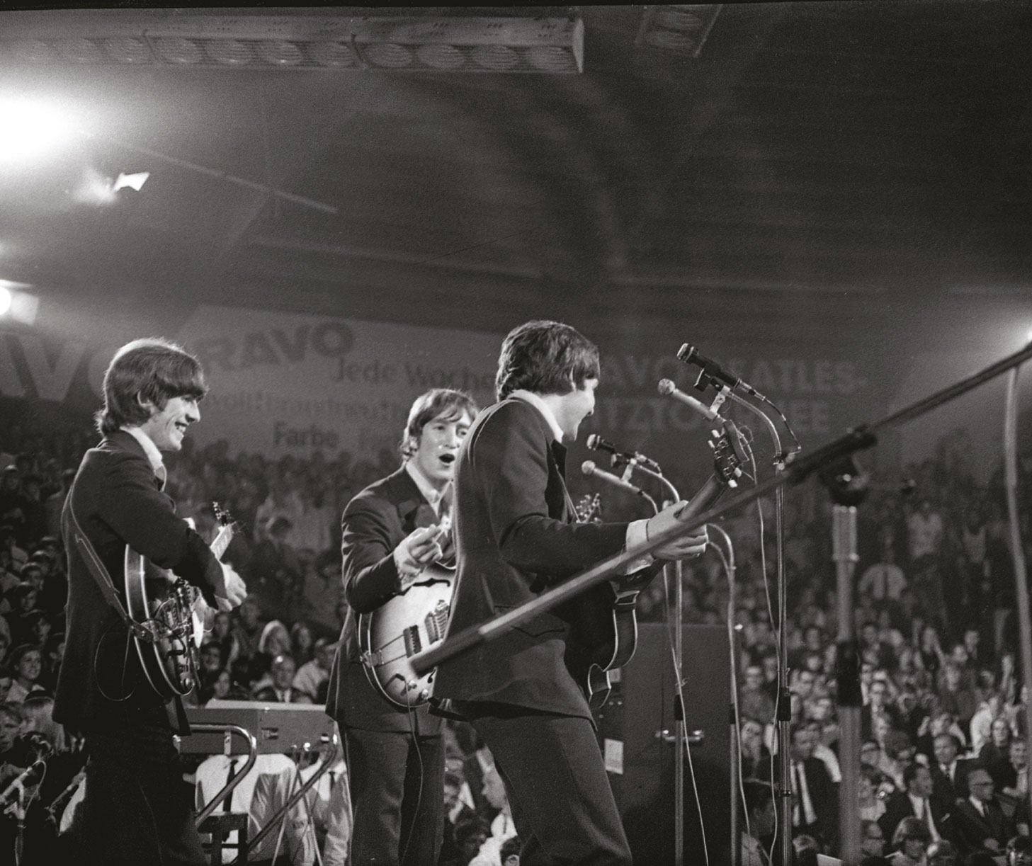 | Circus-Krone-Bau, Munich, Germany, June 24, 1966. With only the briefest of rehearsals in their hotel suite, it was painfully obvious to those who cared to listen that The Beatles were out-of-shape as a live band for their final world tour, evidenced by lacklustre playing, forgotten lyrics and often out-of-tune performances. Much to George’s amusement, John reminds a forgetful Paul of the opening lyric to ‘I’m Down’ at the finale of the evening Munich show. |